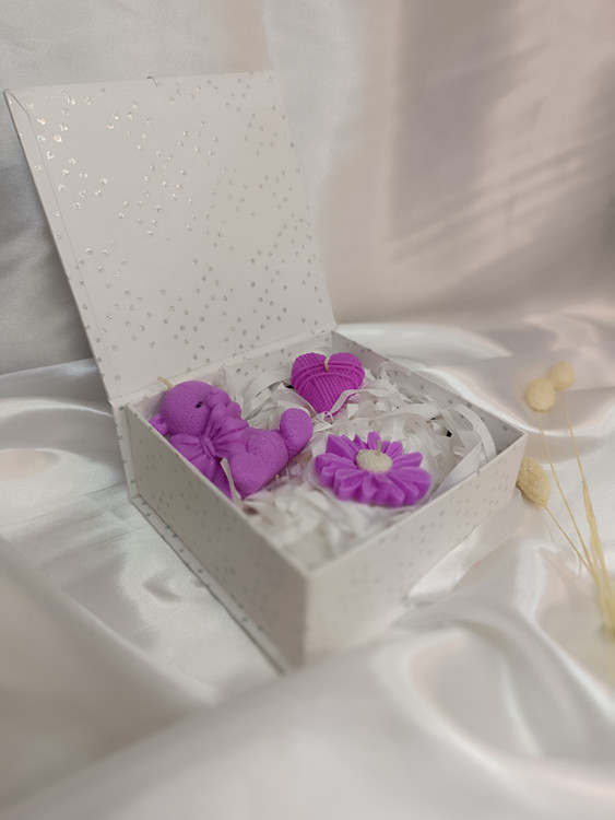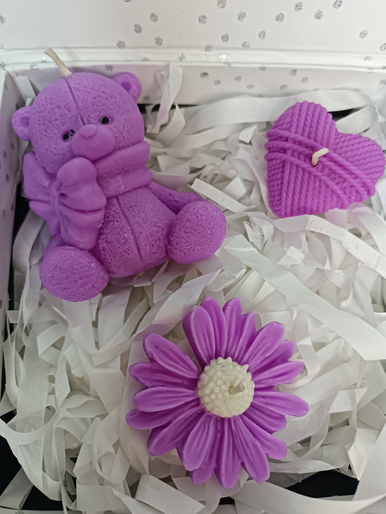 شامل یک عدد شمع خرس،یک عدد شمع قلب،یک عدد شمع مارگریت،یک عدد باکس